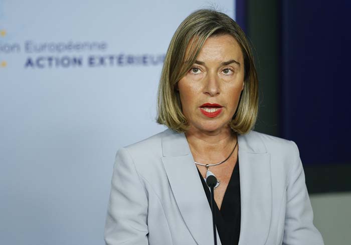 1月11日,在比利时布鲁塞尔,欧盟外交和安全政策高级代表莫盖里尼在新闻发布会上讲话。 新华社记者叶平凡 摄