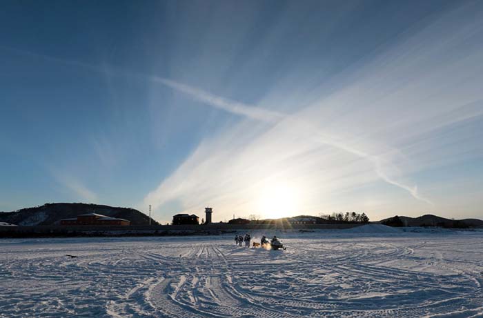 驻守在漠河县北极村的北部战区陆军某部官兵在江面巡逻(2月5日摄)。