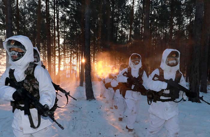 驻守在漠河县北极村的北部战区陆军某部官兵巡逻间隙展开训练(2月5日摄)。 新华社记者李刚 摄