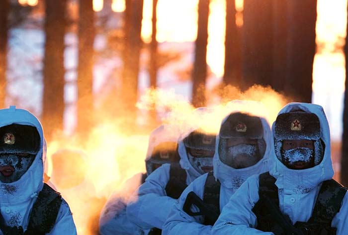 驻守在漠河县北极村的北部战区陆军某部官兵巡逻间隙展开训练(2月5日摄)。 新华社记者 李刚 摄