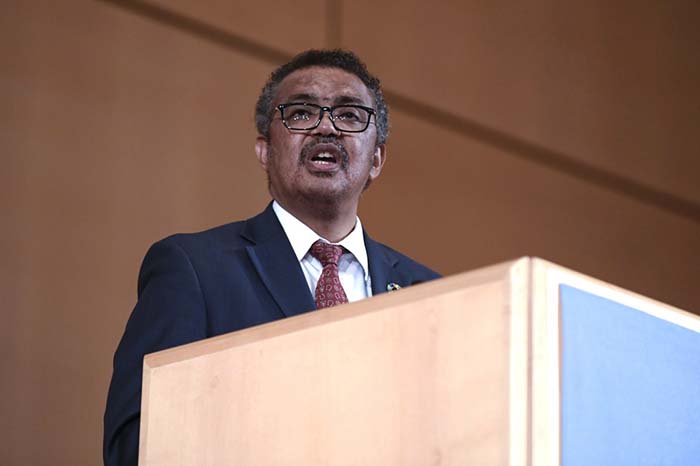 5月21日,在瑞士日内瓦万国宫,世界卫生组织总干事谭德塞在第71届世界卫生大会上发言。 新华社照片(阿兰·格罗克洛德 摄)