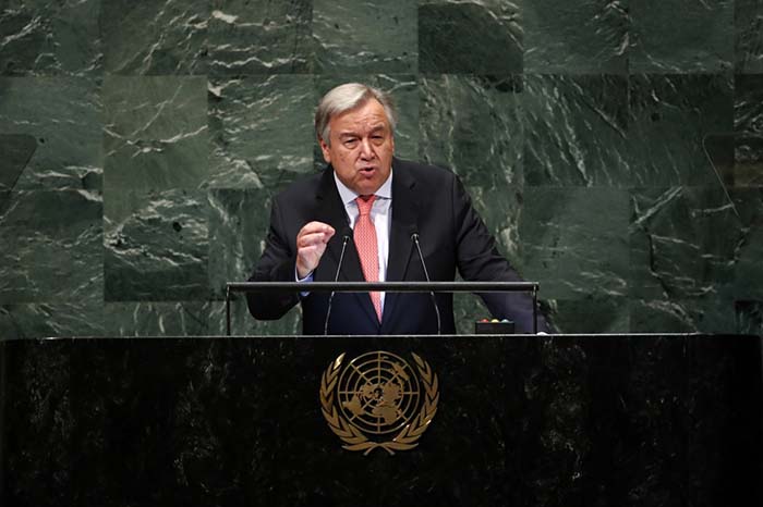 9月25日,在位于纽约的联合国总部,联合国秘书长古特雷斯在联合国大会一般性辩论上发表演讲。 新华社记者李木子 摄