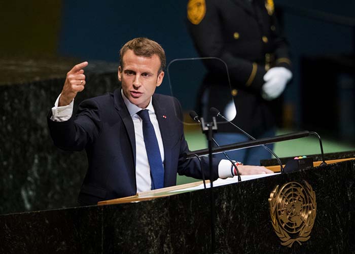 9月25日,在位于纽约的联合国总部,法国总统马克龙在联合国大会一般性辩论上发表演讲。 新华社记者王迎 摄