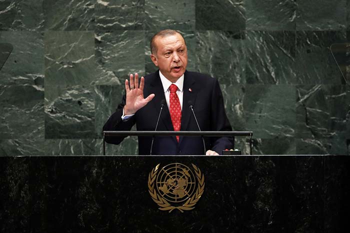 9月25日,在位于纽约的联合国总部,土耳其总统埃尔多安在联合国大会一般性辩论上发表演讲。 新华社记者李木子 摄