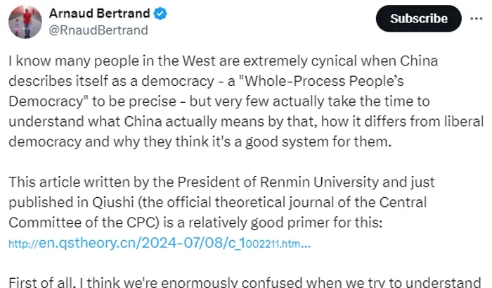 近期,法国企业家、知名“中国通”阿诺德•贝特朗因为阅读了《求是》英文版刊发的由中国人民大学校长林尚立发表的文章《以发展全过程人民民主推动中国式现代化》,有感而发,在海外社交媒体撰写了一条1500英文单词的超长推文,对“中国是否是一个民主国家”这个长期以来被西方世界热议的话题进行了深入阐述。贝特朗目前活跃于海外社交媒体平台X,是单条帖文高达百万级浏览量的意见领袖,也是目前该平台广泛认可的中国话题博主,曾受美国哈佛智库邀请参与中西制度对比的辩论,代表中方立场赢了辩论。
