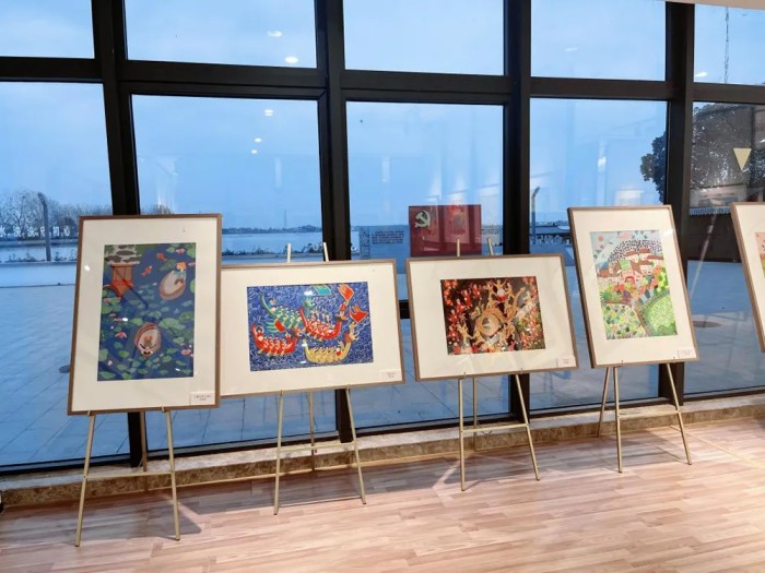2025年12月2日,以“我们生活在这里”为主题的农民画展在浙江省嘉兴市秀洲区油车港镇胜丰村的中国现代民间绘画秀洲创作基地举办。(拍摄/陶幸)