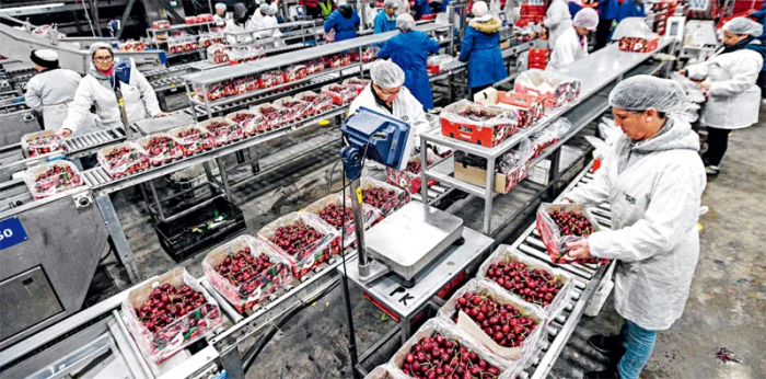 2024年 12月13日 在智利莫斯塔萨尔的一座吉制公司工厂,工作人员处理车厘子。(新华社发)