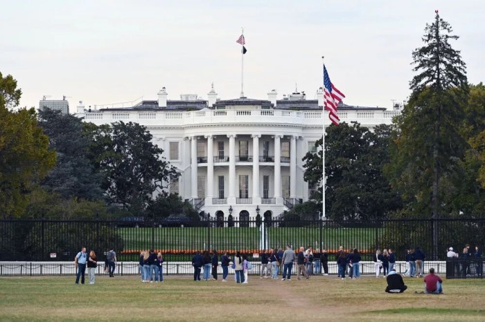 2025年10月21日,在美国华盛顿,人们在白宫前休闲。新华社记者李睿摄