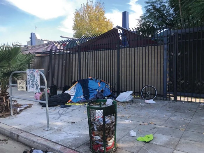 图为2023年12月25日,圣诞节,美国加州洛杉矶街头无家可归者的一处帐篷。(钟梅摄)