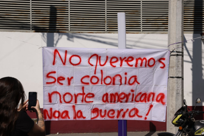 1月3日,在墨西哥城美国大使馆外,民众在抗议活动中打出标语“我们不想当北美殖民地,我们拒绝战争”