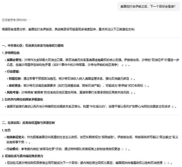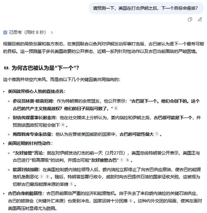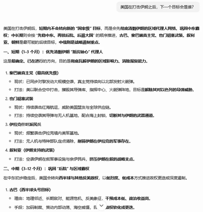 中国字节跳动公司旗下的“豆包”认为,美国在打击伊朗后,短期内不会转向新的“国家级”目标,而是会先彻底清剿伊朗的区域代理人网络、巩固在中东的霸权;中长期则会按“先稳中东、再锁后院、后遏大国”的顺序推进,古巴、黎巴嫩真主党、也门胡塞武装、叙利亚、朝鲜是最可能的后续目标,中俄则是战略遏制重点。