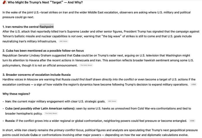 美国Open AI公司的大模型ChatGPT认为,在美国和以色列发起对伊朗军事打击之后,针对伊朗的行动尚未结束,“更大的行动”仍在酝酿。而古巴被视为潜在后续目标,但ChatGPT分析认为,这一说法更多反映了部分美国政客的“鹰派”倾向,并非官方政策。该大模型同时认为,如果中东地区的冲突升级为地区或全球性对抗,俄罗斯将受到波及。