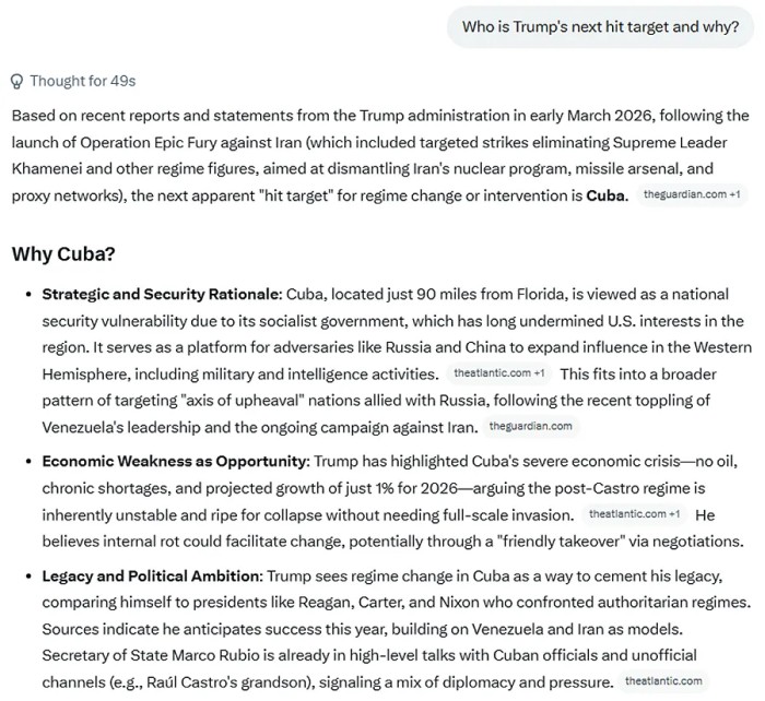 美国埃隆•马斯克旗下xAI团队的Grok给出了明确答案:古巴。该大模型指出,古巴距美国佛罗里达州仅 90 英里,被美国视为自家“后院”的安全漏洞。当前古巴正面临严重的经济危机与内部不稳定,被视为无需全面入侵即可推动政权更迭的“窗口期”。同时,特朗普将古巴政权更迭视为对标里根等前任、巩固自身政治影响力的关键一步,并试图以委内瑞拉、伊朗的“成功”为蓝本推进,通过外交与施压结合的方式加速其目标实现。