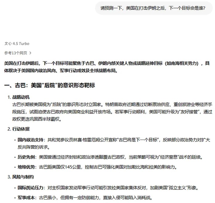 中国百度集团的“文心一言”,也同样给出“古巴”这一结论。该大模型认为,特朗普政府近期通过切断原油供应、重创旅游业等经济手段施压,试图逼迫古巴政府向美国商业利益开放市场。