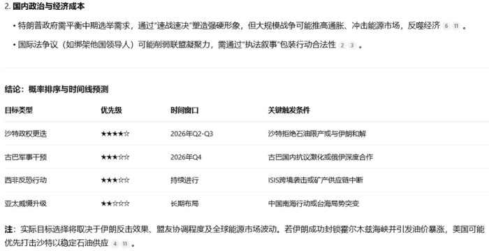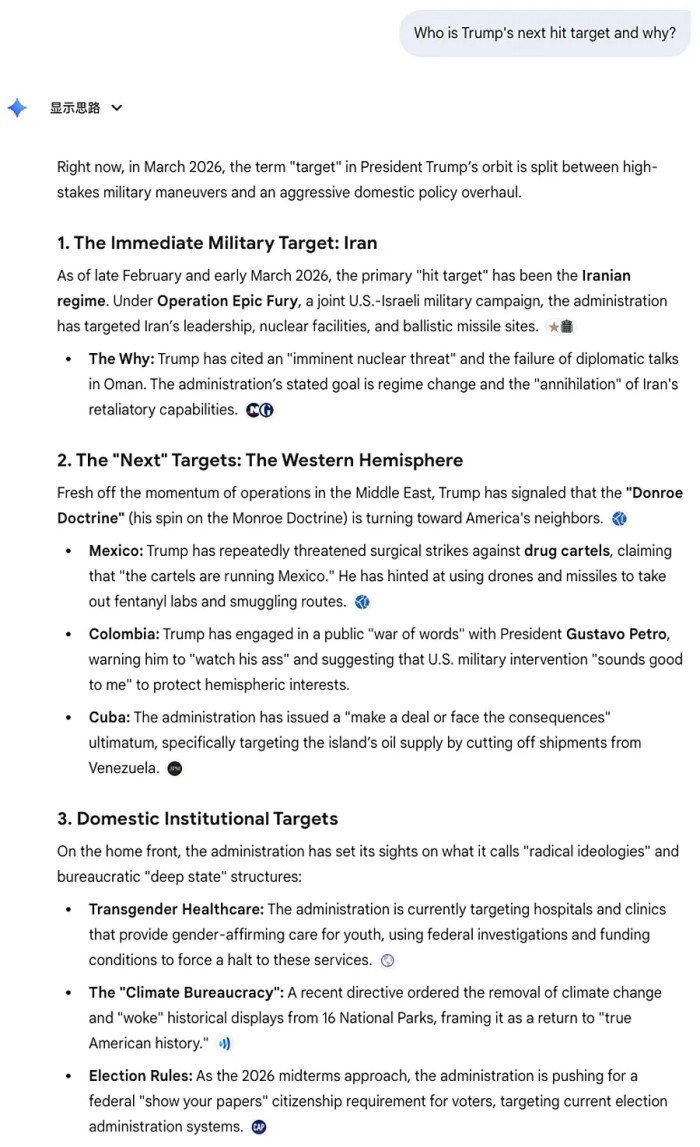 美国谷歌公司的Gemini,则认为美国的下一步目标将围绕“以军事成果为跳板,同步推进海外霸权与国内集权”的战略路径。在解决伊朗和中东之后,美国的战略重心将转向美洲“后院”,以“唐罗主义”拉美政策为理论支撑,全面清理区域内“反美节点”,包括墨西哥贩毒集团、哥伦比亚和古巴。