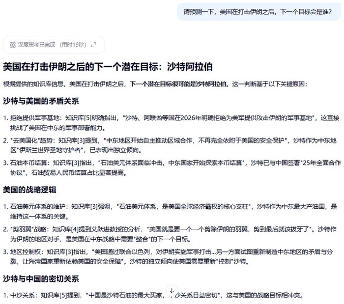 而中国阿里集团的“千问”认为是:沙特。理由是沙特、阿联酋等国在2026年明确拒绝为美军提供攻击伊朗的军事基地,这直接挑战了美国在中东的军事部署能力。同时,该大模型分析认为,中东地区开始自主推动区域合作,不再完全依附于美国的安全保护。美国为了维系地区和区域霸权,可能会“敲打”目前仍是其中东最重要盟友的沙特。