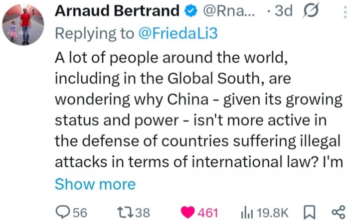 在提问中,不少海外网友关注中国日益增长的国际影响力。来自法国的企业家阿诺德•贝特朗(Arnaud Bertrand)留言称,国际上很多人(包括全球南方国家)有个共同的疑问:中国现在实力地位上来了,为什么不在国际法框架下,更积极地维护那些遭受攻击的国家……