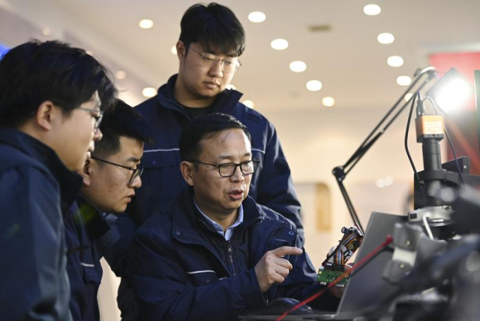 1月14日,在位于中国铁路西安局集团有限公司西安动车段的董宏涛国家级技能大师工作室,全国人大代表董宏涛(前右)和工作室成员研讨业务。董宏涛是业内有名的高铁动车组“全科医生”,投身检修工作以来成绩斐然。同时他致力于“传帮带”,依托国家级技能大师工作室为产业一线培养了大批技能型人才。2026年全国两会,他继续聚焦技能人才队伍建设,关注“新八级工”制度落地问题。新华社记者李一博 摄