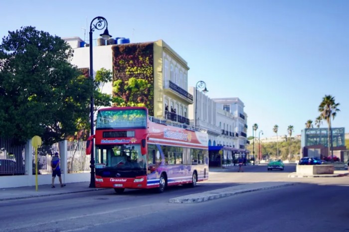 2月13日,在古巴首都哈瓦那,一辆旅游巴士行驶在街道上。古巴旅游旺季遭遇了美石油禁令寒流,难觅往年旅游旺季的繁忙景象。(新华社)