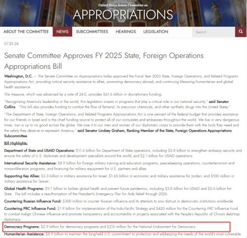 2025年,埃隆・马斯克主导的美国“政府效率部”曾掀起联邦预算“瘦身风暴”,高调宣称大幅削减包括对外援助在内的冗余开支。但这场风暴并未真正波及NED。根据美国国会参议院拨款委员会数据,2025财年NED获得的政府拨款达到约3.15亿美元。更值得注意的是,美国国会还授予该基金会更大规模的“应急基金”,使其能够在叙利亚局势变动、玻利维亚大选等所谓“机会之窗”出现时,迅速投入资源。