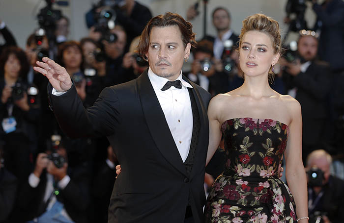 9月5日,在意大利威尼斯举行的第72届威尼斯电影节上,约翰尼·德普(左)和妻子安伯·赫德出席《丹麦女孩》首映式。