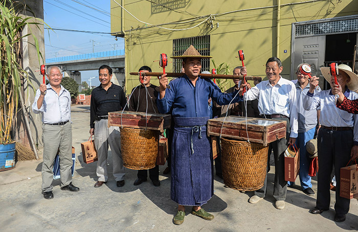 10月24日,上杨村铭悦传统红糖厂的工作人员身着义乌农民传统服饰,挑着货郎担,庆祝传统红糖季的开始。