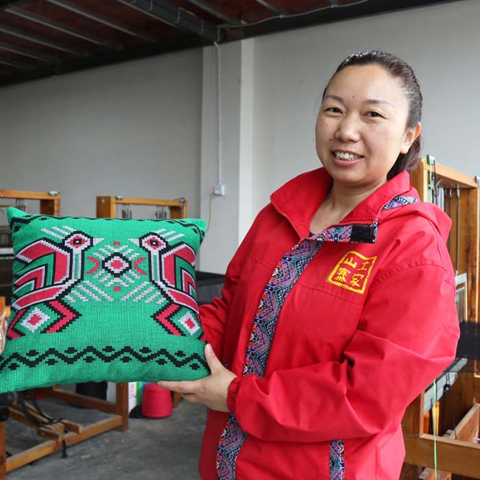 4月9日,在湖北恩施旗峰坝“西兰卡普”生产车间,民间艺人田若兰在展示“西兰卡普”靠垫。 新华社发(张子家 摄)