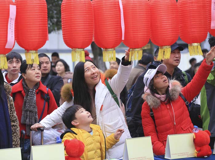 2月19日,在重庆北站,出行的旅客参加猜灯谜活动。 新华社发(吴吉斌 摄)