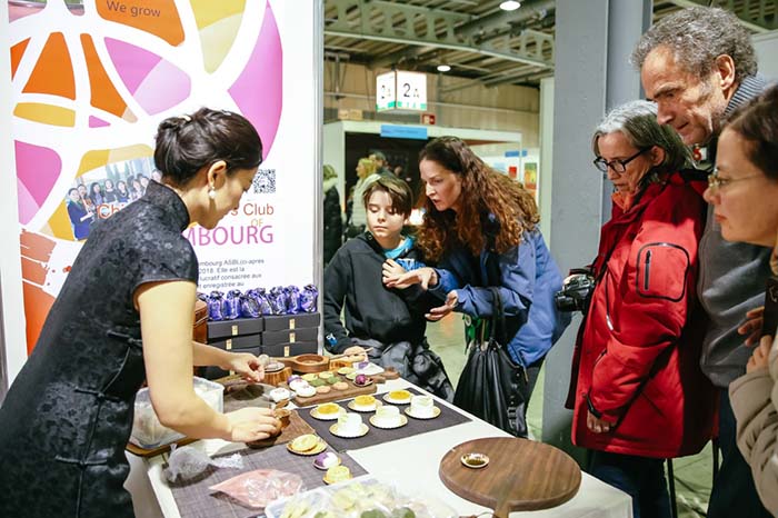 3月3日,观众在卢森堡移民文化节中国展台了解中式甜点。