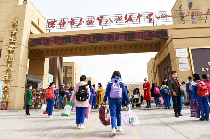 喀什市东城第八初级中学的初三学生返回学校(3月15日摄)。