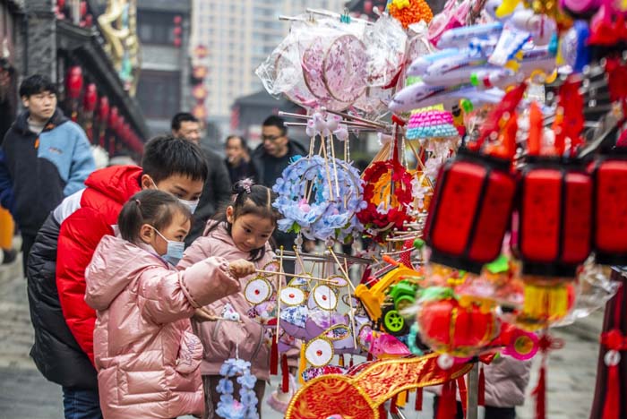 2月13日,小朋友在江苏省泰州市凤城河景区老街集市上挑选花灯。 新华社发(汤德宏 摄)