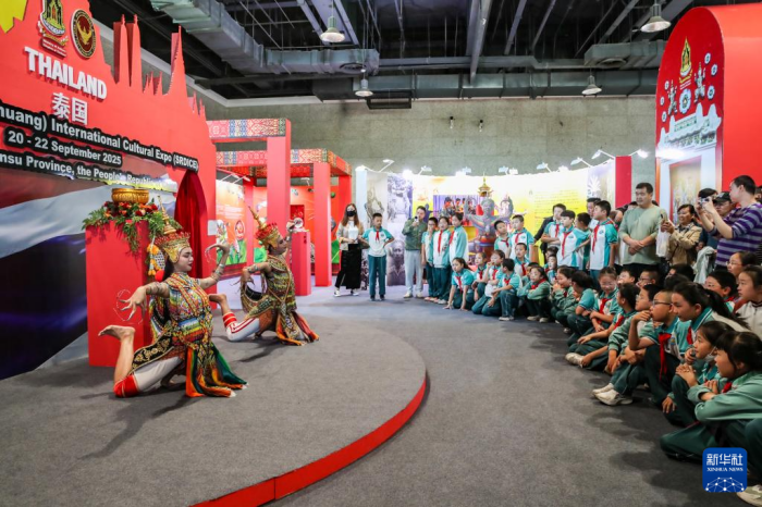 9月22日,学生在敦煌文博会上观看演出。新华社记者郎兵兵 摄