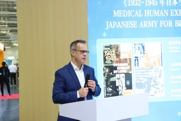 当地时间10月15日,《1932—1945年日本生物战部队在中国进行的医学人体实验》中、英文版图书首发式在法兰克福书展举行。首发式由中国外文局、中国驻法兰克福总领事馆和四川新华出版发行集团指导,中国对外书刊出版发行中心和新华文轩出版传媒股份有限公司主办,新星出版社和四川人民出版社承办,中国图书贸易有限公司(德国)协办。中国外文局副局长余应福,中国驻法兰克福总领事黄昳扬,四川新华出版发行集团党委书记、董事长,新华文轩出版传媒股份有限公司党委书记、董事长周青,新星出版社社长马汝军,图书作者、德国海德堡大学医学院全球卫生研究院院长蒂尔•巴尼格豪森等以不同形式出席活动。
