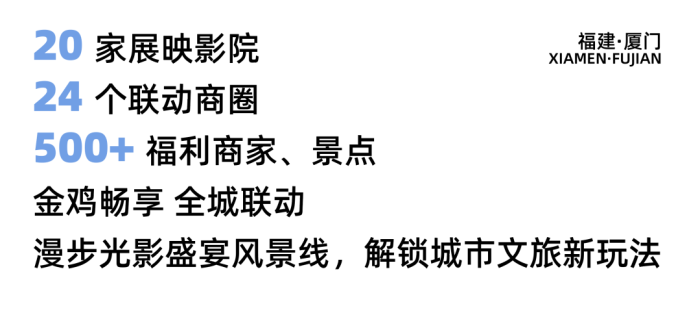 ✨2025年中国金鸡百花电影节很快就要如期启幕了!为了进一步丰富市民的精神文化生活,厦门市首次推出2025年金鸡百花电影生活季——“金鸡带你看厦门·跟着电影品生活”文旅商系列消费活动,活动从11月1日起至12月31日,将通过影视与文旅、餐饮、商贸等的深度融合,为全国影迷打造“电影走进生活,生活充满电影”的城市文旅体验。在这个属于金鸡的高光时节,让我们跟着电影解锁厦门新玩法吧。