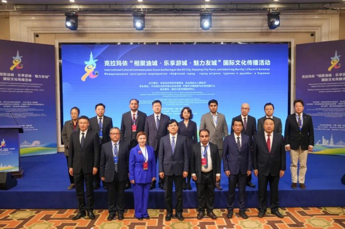 11月13日,以“相聚油城·乐享游城·魅力友城”为主题的国际文化传播活动在克拉玛依市开幕,出席活动领导嘉宾和来自俄罗斯、埃及、巴基斯坦等国的媒体记者,国际友好城市政府部门代表,中央、自治区主要媒体、网络达人,石油行业、文体旅企业代表,以及高校宣传文化相关领域专家学者在台前合影留念。克拉玛依融媒体记者 闵勇 摄