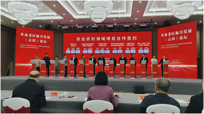 论坛期间,还举行了一系列项目签约、品牌推介、公益捐赠等活动,签约范围涵盖现代农业、文旅融合及产销对接等多个关键领域。活动还举行了饮水思源专项基金捐赠仪式及优秀案例交流环节,邀请福建上杭、陕西延安山西大同等11个单位代表作经验交流,案例涵盖产业振兴、文旅融合、职教帮扶等多个领域,为全国老区发展提供可复制的借鉴。