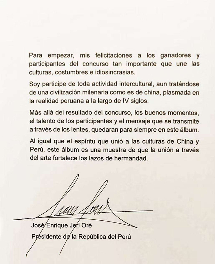 耶里在贺信中指出:“我关注所有跨文化的交流与活动,尤其是绵延数千年的中华文明,已经在秘鲁的现实社会中经历了4个世纪的交流与融合。”