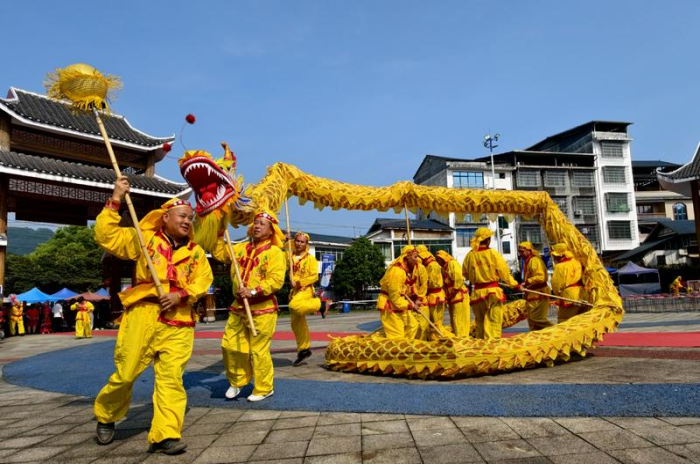 4月19日,在广西柳州市融安县板榄镇欢歌广场举行的“三月三”活动上,民间艺人表演舞龙。新华社发(谭克兴 摄
