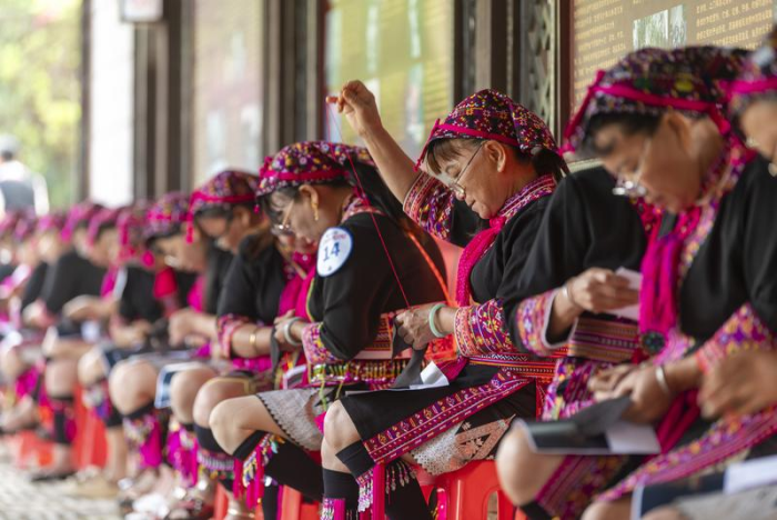 4月19日,海南省琼海市会山镇的苗族妇女在“三月三”活动上参加苗绣比赛。新华社发(蒙钟德 摄)
