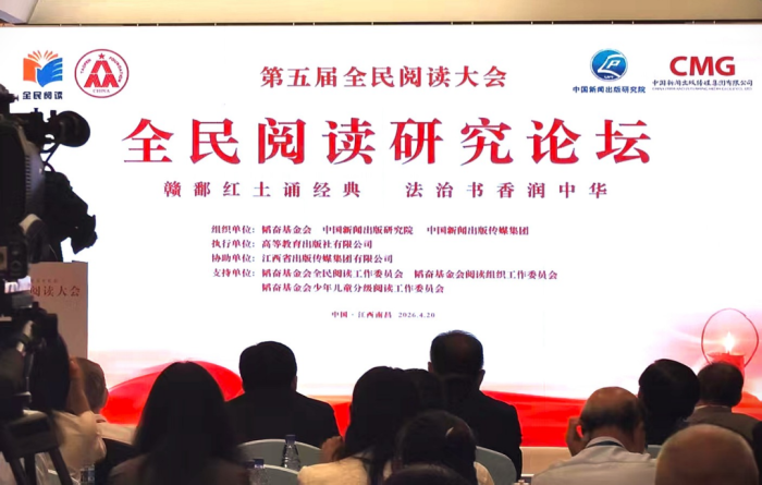 4月20日,第五届全民阅读大会·全民阅读研究论坛在江西南昌举办。全国政协副主席、民进中央常务副主席朱永新,江西省政协主席宋福龙,中国外文局局长常勃出席论坛并致辞,中国出版集团、中国教育出版传媒集团等单位负责人及全国出版、教育、学术、媒体界等百余位代表参加论坛,围绕全民阅读理论创新、红色基因出版转化、数智时代阅读服务等话题深入研讨交流。论坛以 “赣鄱红土诵经典,法治书香润中华” 为主题,由韬奋基金会、中国新闻出版研究院、中国新闻出版传媒集团等单位联合主办。